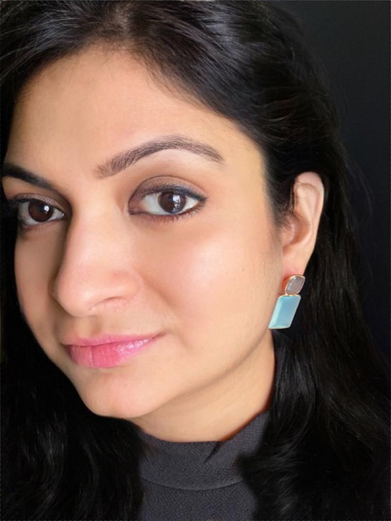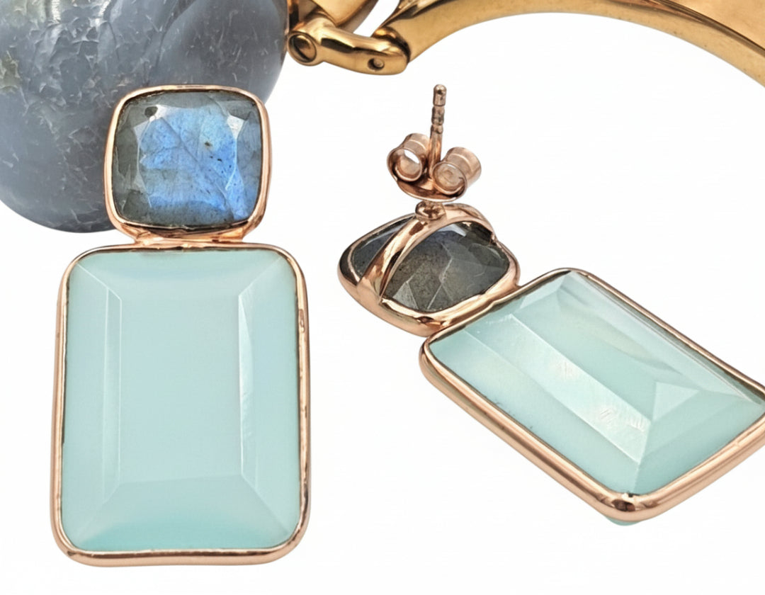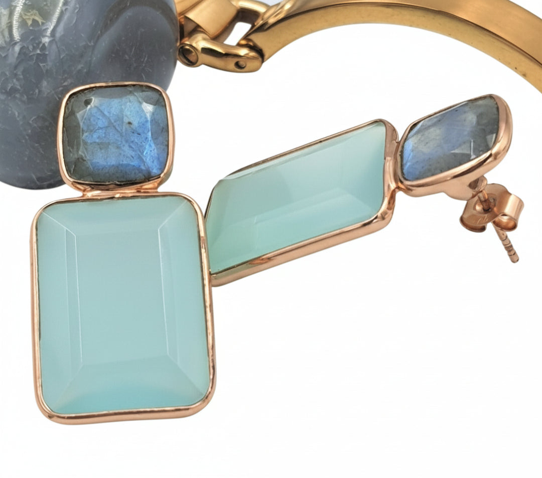 These earrings, made of Labradorite and Aqua Chalcedony stones, bring in an oceanic calmness, reflecting the soothing shades of water and sky. The beauty of the stones is enhanced by their beautiful octagonal cut, allowing the mesmerizing play of colors to capture the essence of serene aquatic depths. Adorn yourself with this exquisite pair and carry a sense of tranquil elegance that mirrors the peaceful embrace of the sea.