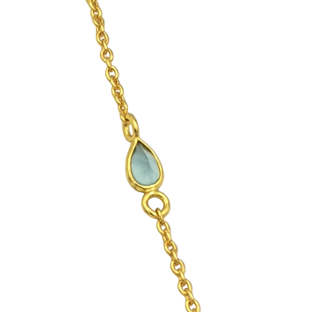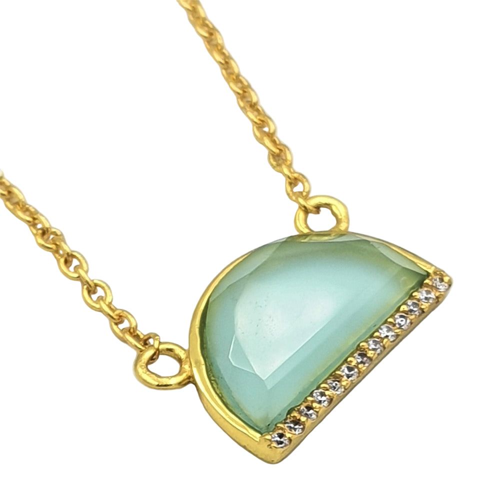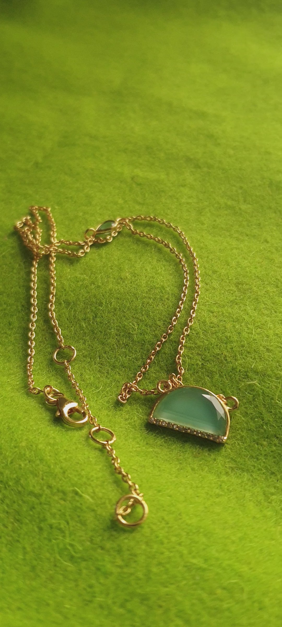 This necklace made of Aqua Chalcedony and Cubic Zirconia stones is an elegant contemporary design, with a soothing blue shade and just the right amount of bling. The little drop on one side gives it a unique touch of beauty.