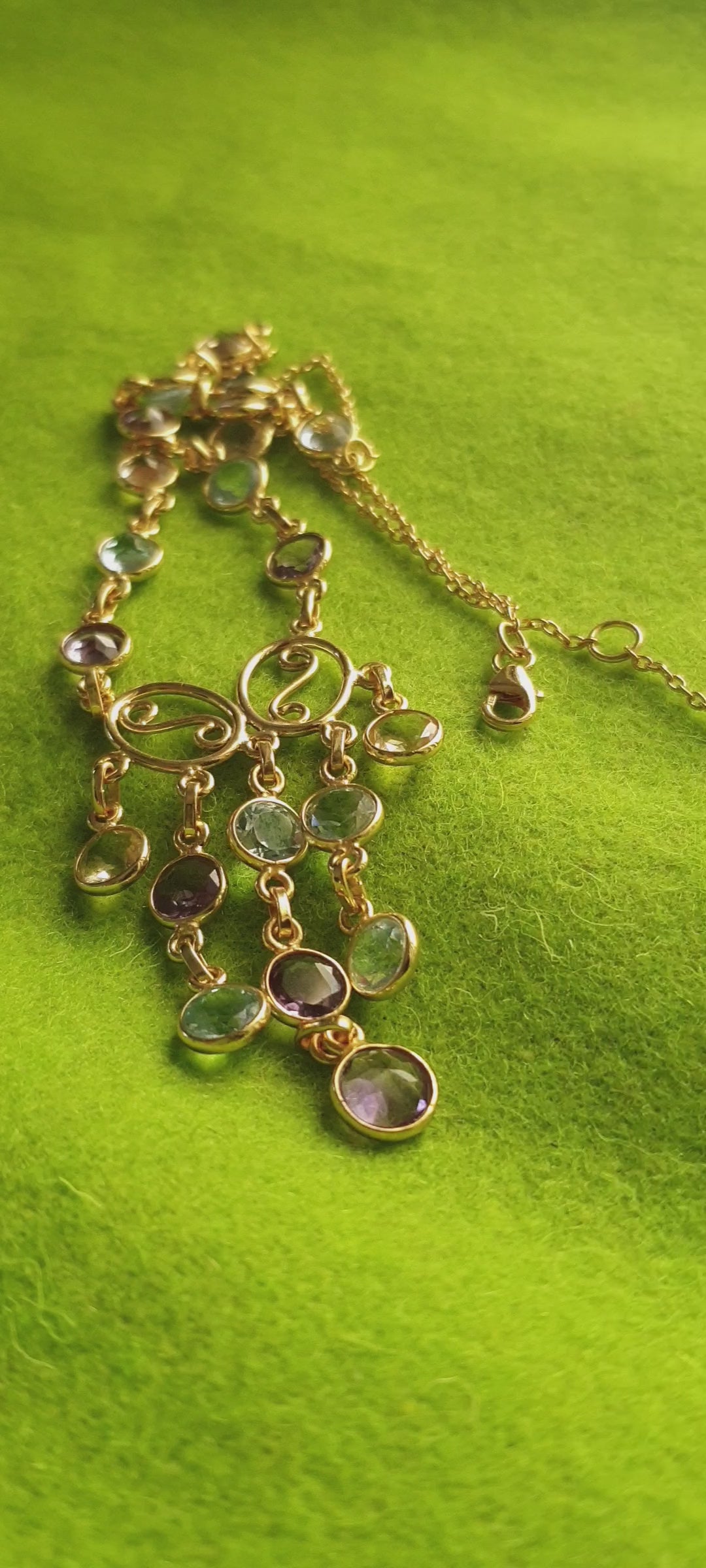 Embrace the essence of beauty with our stunning Tricolor Amethyst, Blue Topaz, and Citrine Necklace. Crafted with meticulous attention to detail, this necklace showcases an exquisite design and a harmonious blend of vibrant colors. True to its name, the unique combination of these gemstones is a visual masterpiece that is guaranteed to captivate the attention of all beholders, making it a true statement piece.