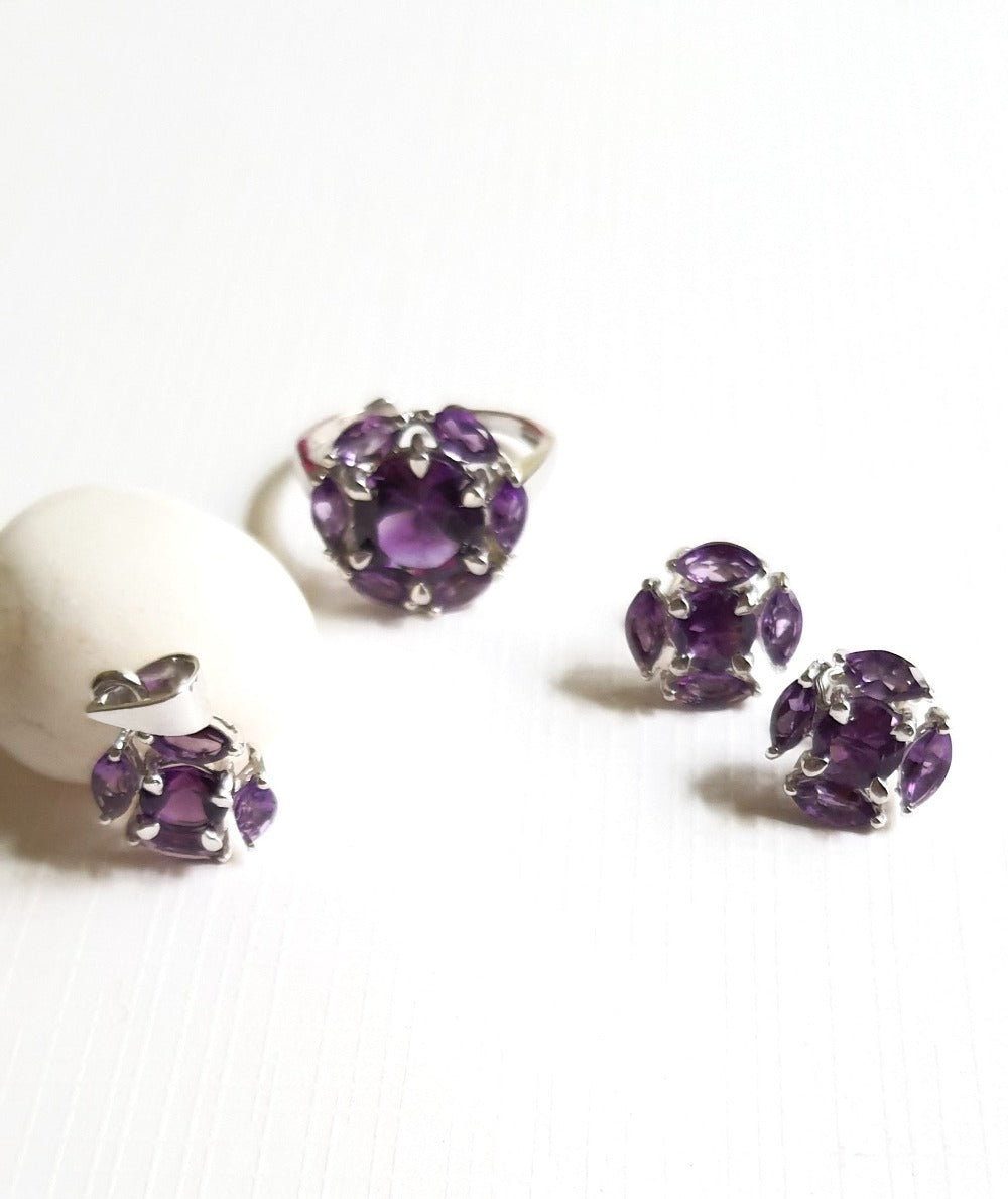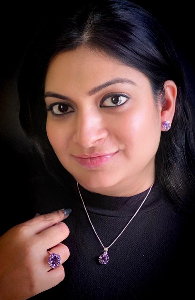 This enchanting set of Earrings, Pendant with Chain and adjustable Finger Ring are made of Amethyst Stone. This set provides you with a complete package for you to dazzle through your day.