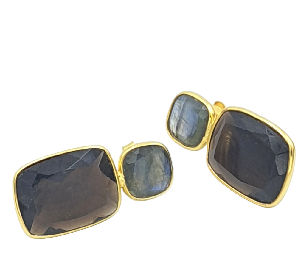 These earrings made of Smoky Quartz (Smoky Topaz) and Labradorite symbolize the harmonious amalgamation of earth and sky, capturing the serene beauty of nature's elements. The enchanting play of colors within the Labradorite stones, coupled with their exquisite octagonal cut, adds a touch of mystique that resonates with the infinite expanse above and below. Adorn yourself with this exquisite pair, and carry a piece of nature's unity and elegance with every graceful movement.