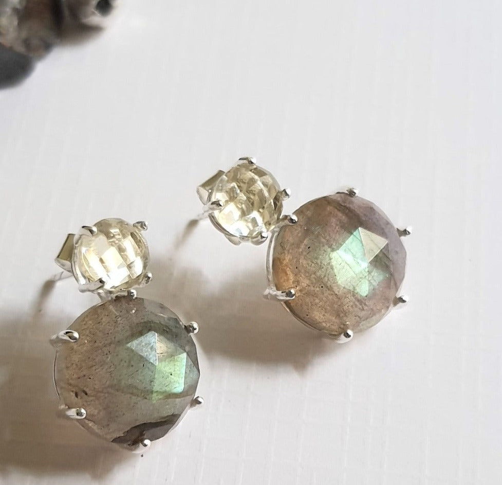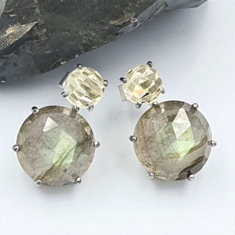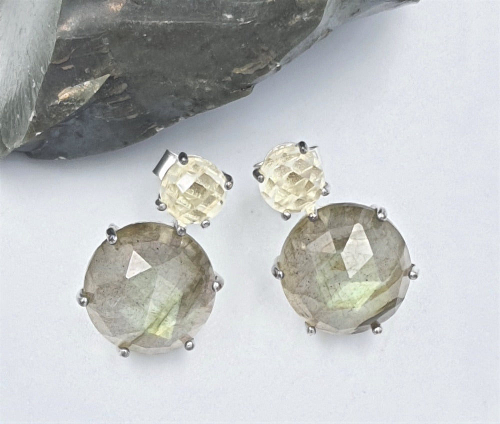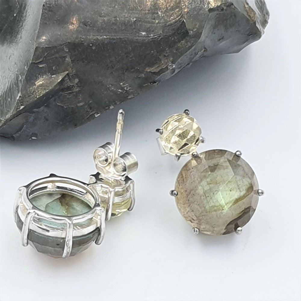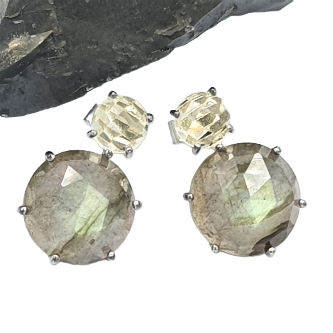 These beautiful earrings, made of Labradorite and Lemon Topaz stones, boast an enchanting interplay of colors that is heightened by their exquisite cut and design. The captivating dance of hues within the Labradorite, coupled with the vibrant sparkle of Lemon Topaz, ensures that both the wearer and onlookers alike will be captivated by their mesmerizing beauty. Adorn yourself with this exquisite pair, and let their allure become a source of fascination wherever you go.