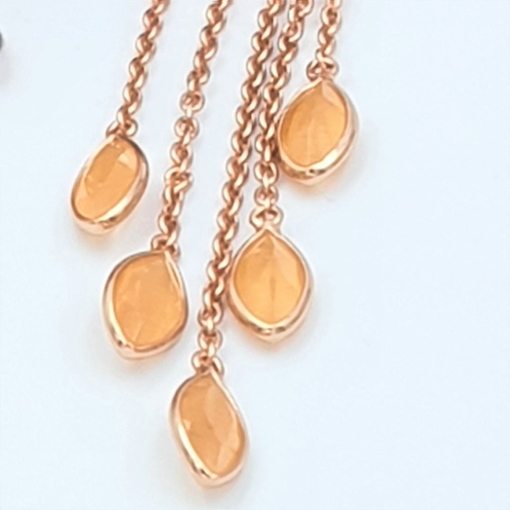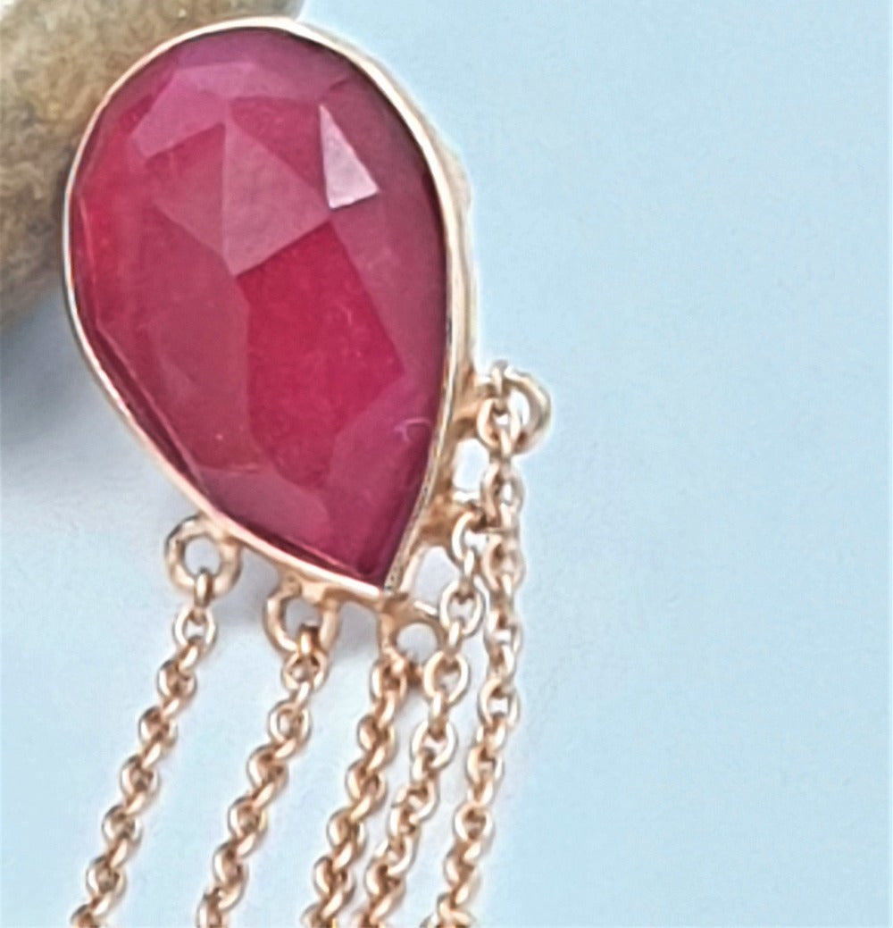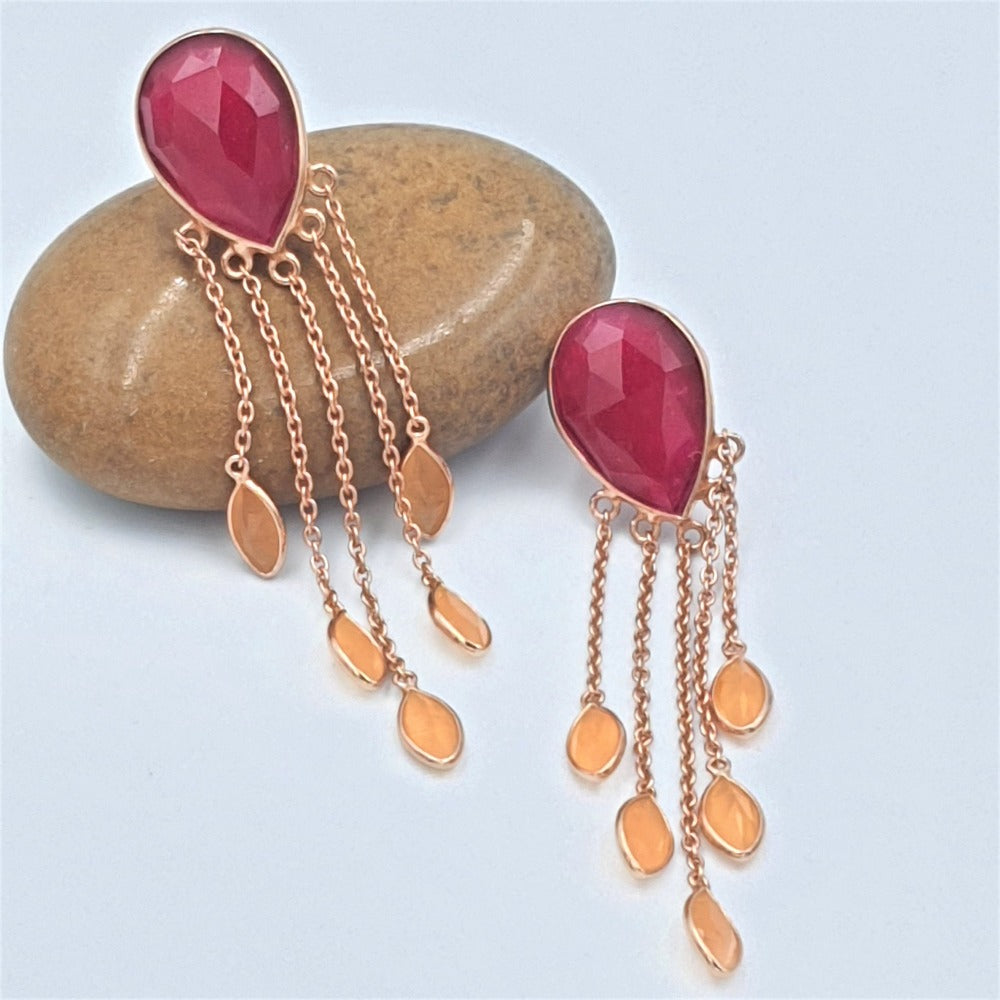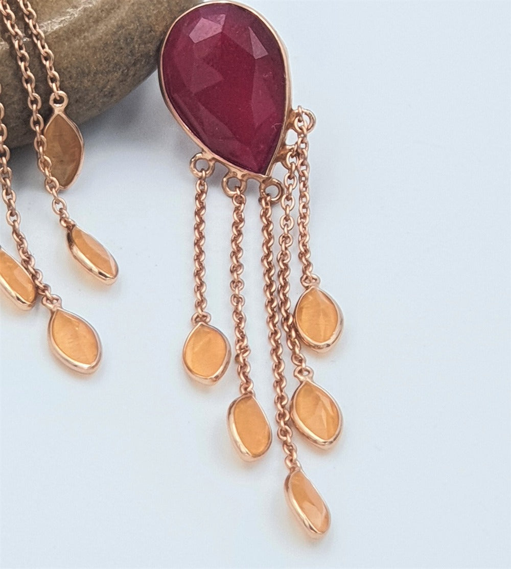 The dark dyed Ruby and the Peach Moonstones, meticulously crafted in this design, resemble enchanting "Moon Drops," casting a spell of mystical allure upon your beauty. Adorn yourself with this exquisite combination of hues and design, and let the ethereal charm of these earrings illuminate your elegance with every graceful movement.