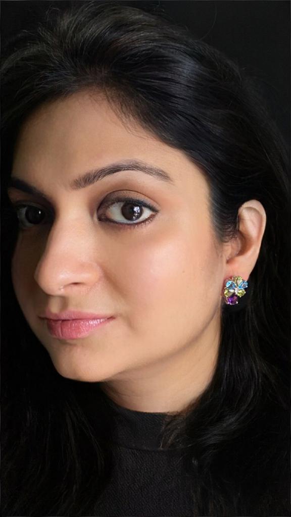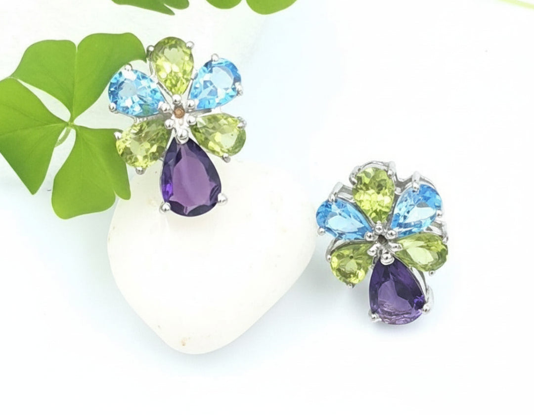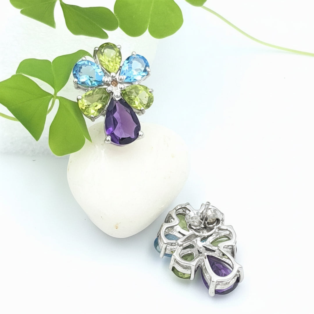 This magnificent pair of earrings, made of Blue Topaz, Peridot, and Amethyst Stones, reminds you of the full spread of a peacock's train. The vivid hues and graceful arrangement capture the majestic beauty of this iconic bird, adding a touch of regal splendor to your ensemble. Adorn yourself with these exquisite earrings, and let them be a symbol of your own unique radiance and elegance.