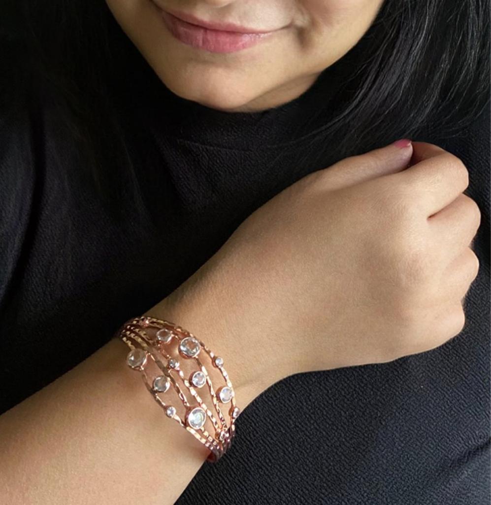 Each stone is bezel-set to enhance its brilliance, catching the light with every movement. The rose-gold toned finish on silver complements the icy shimmer of White Topaz, making it versatile enough for both office chic and evening sophistication.