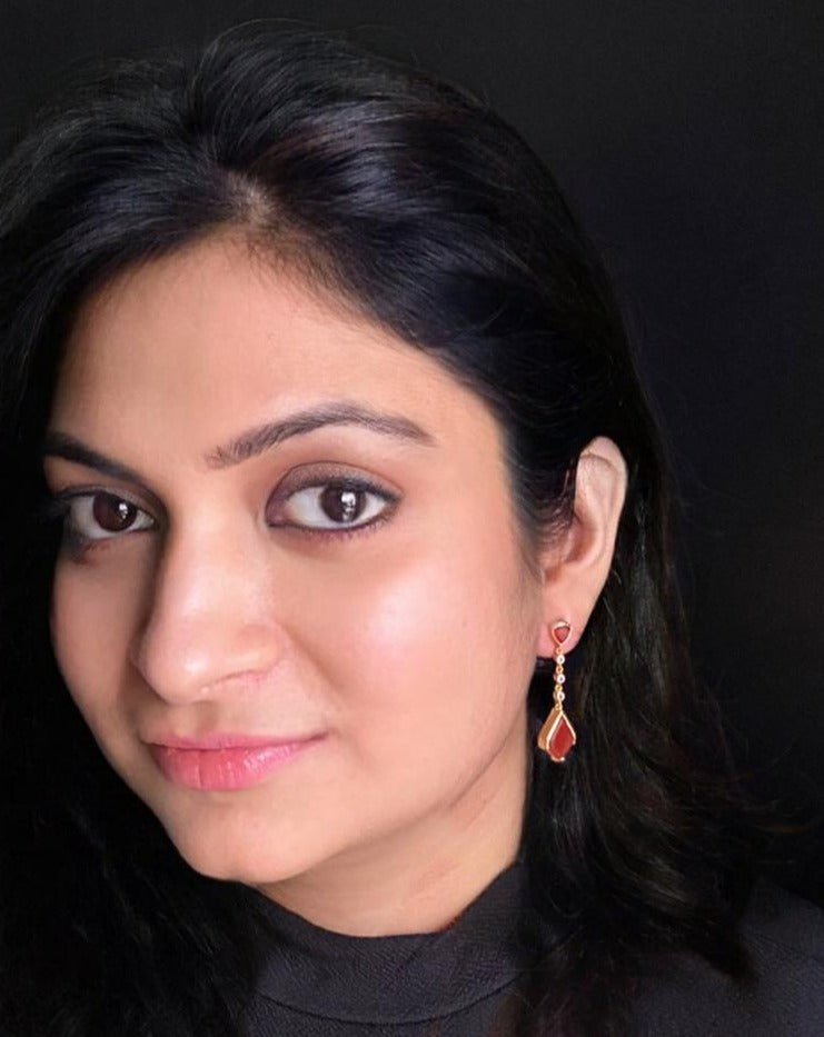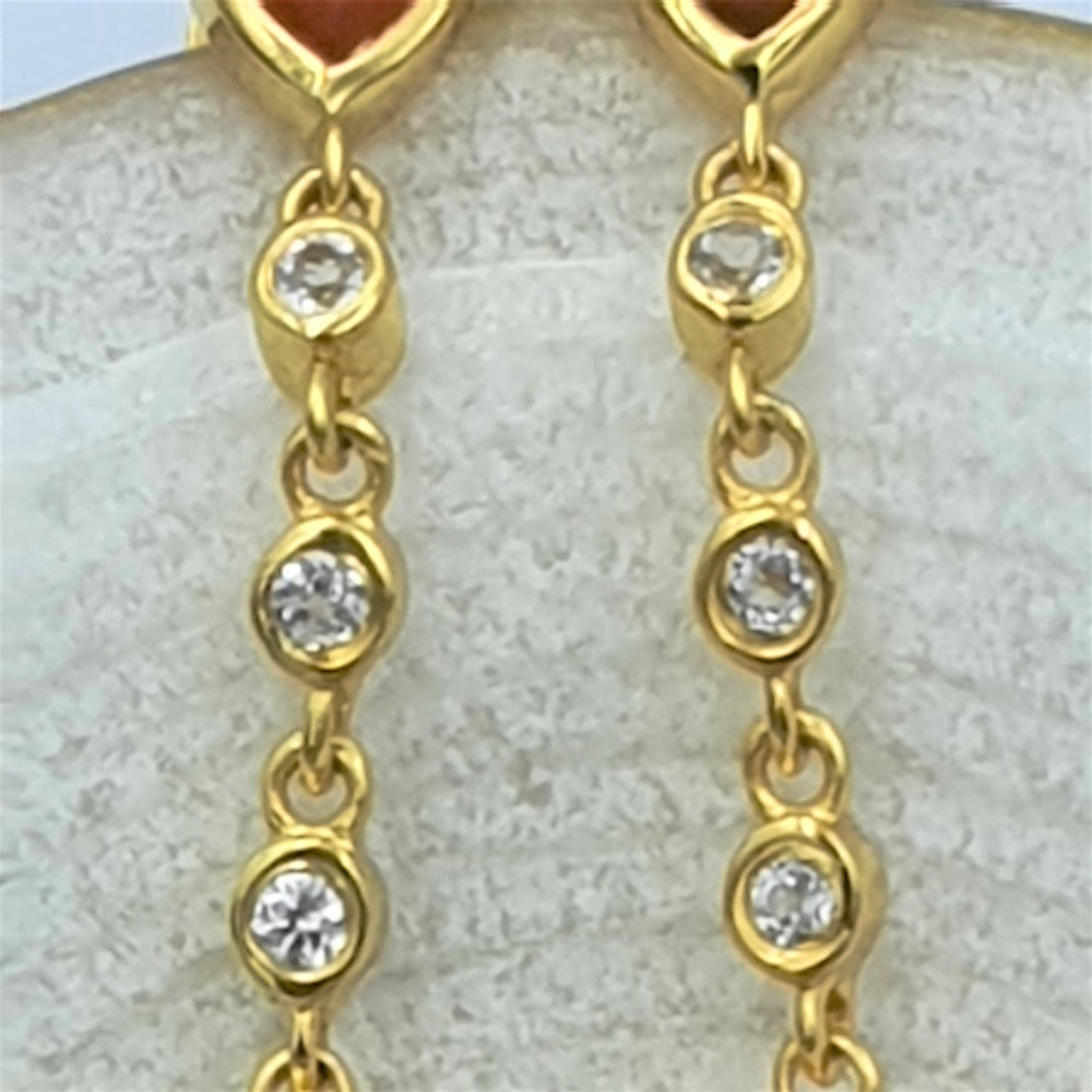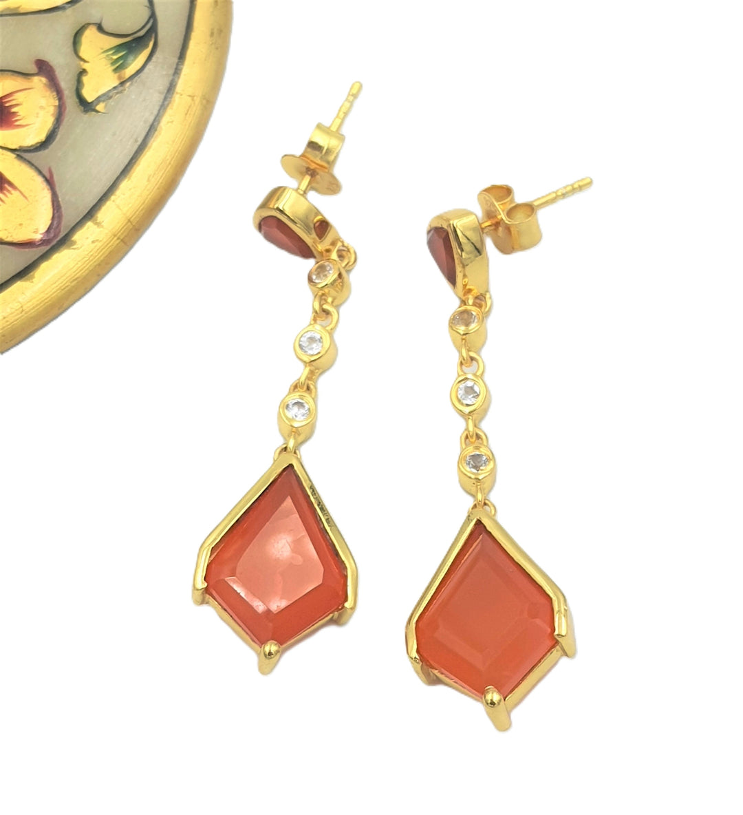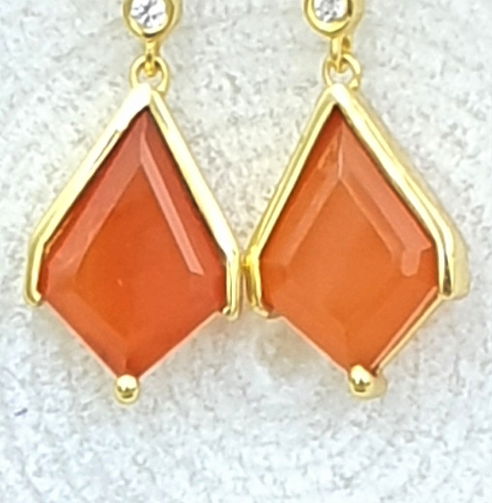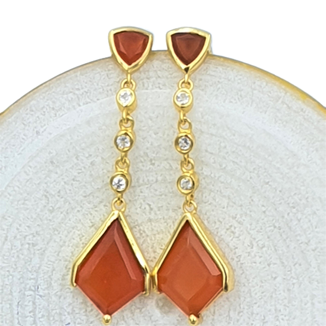 These earrings, made of Orange Onyx and White Topaz stones with Gold plating, bring in a refreshing and elegant look. As if fashioned by Cupid himself, these Orange Onyx "arrows" have the power to generate a sense of love and admiration. Adorn yourself with this exquisite pair, and let their charm and beauty make hearts flutter wherever you go.