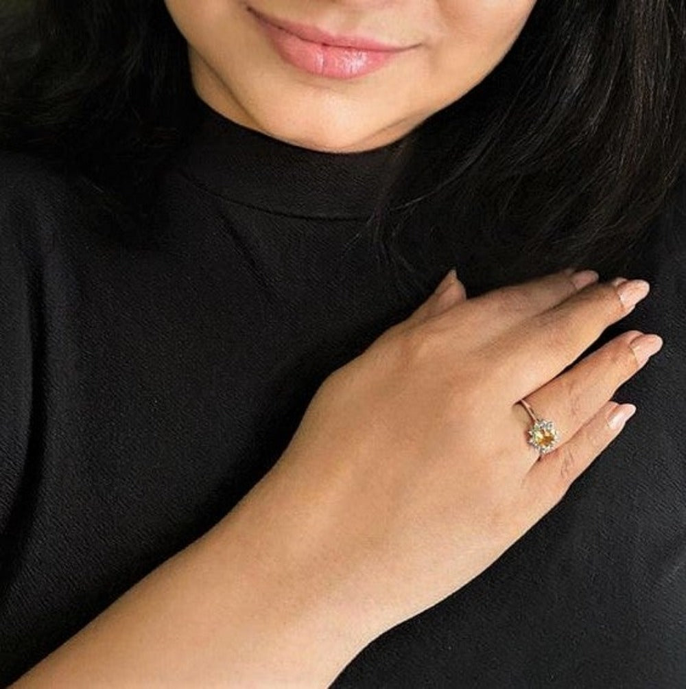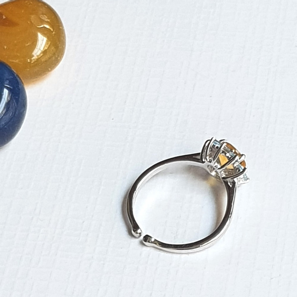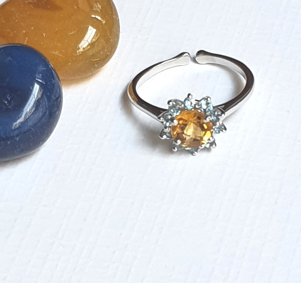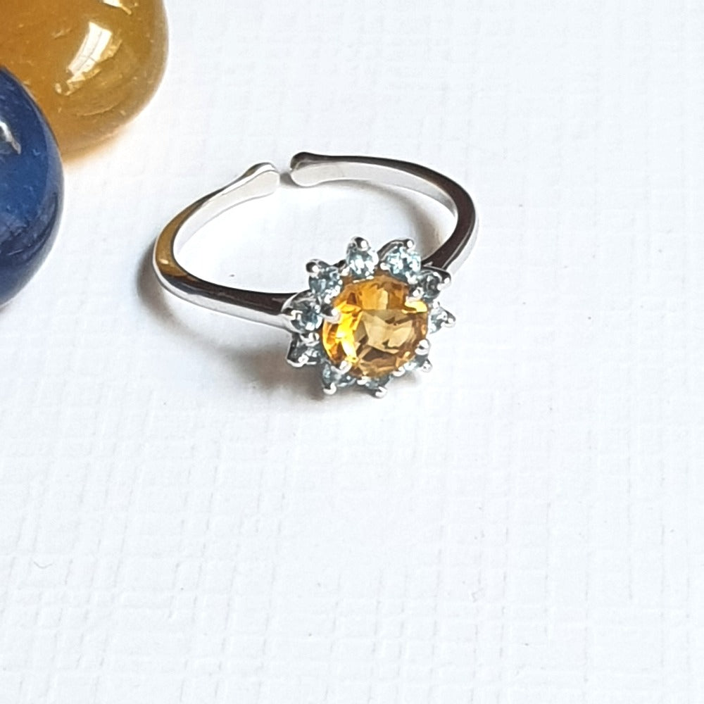 This adjustable finger ring is made of Citrine and a Blue Topaz stone and is an elegant piece of craftsmanship. Just like the sunny sky keeps your mood sunny, this too shall. Wishing you all the happiness!