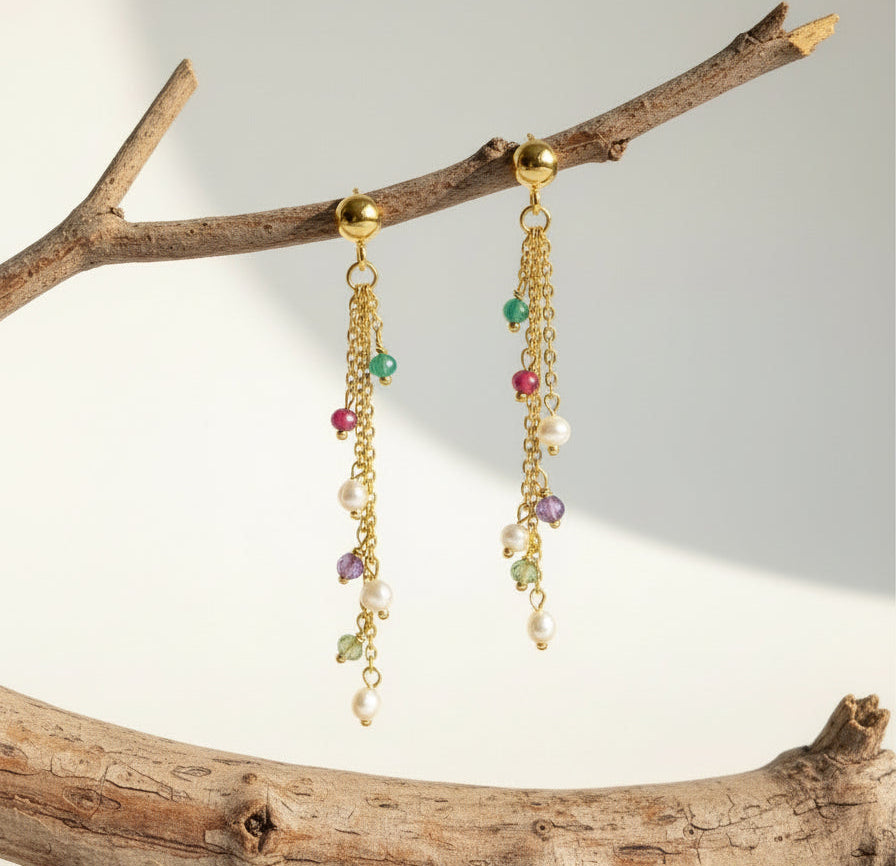 Introducing our vibrant and playful multi gemstone Sterling Silver Earrings, a symphony of color and elegance. Crafted with sterling silver, these earrings feature an array of gemstones that dance with every movement, creating a captivating spectacle.
