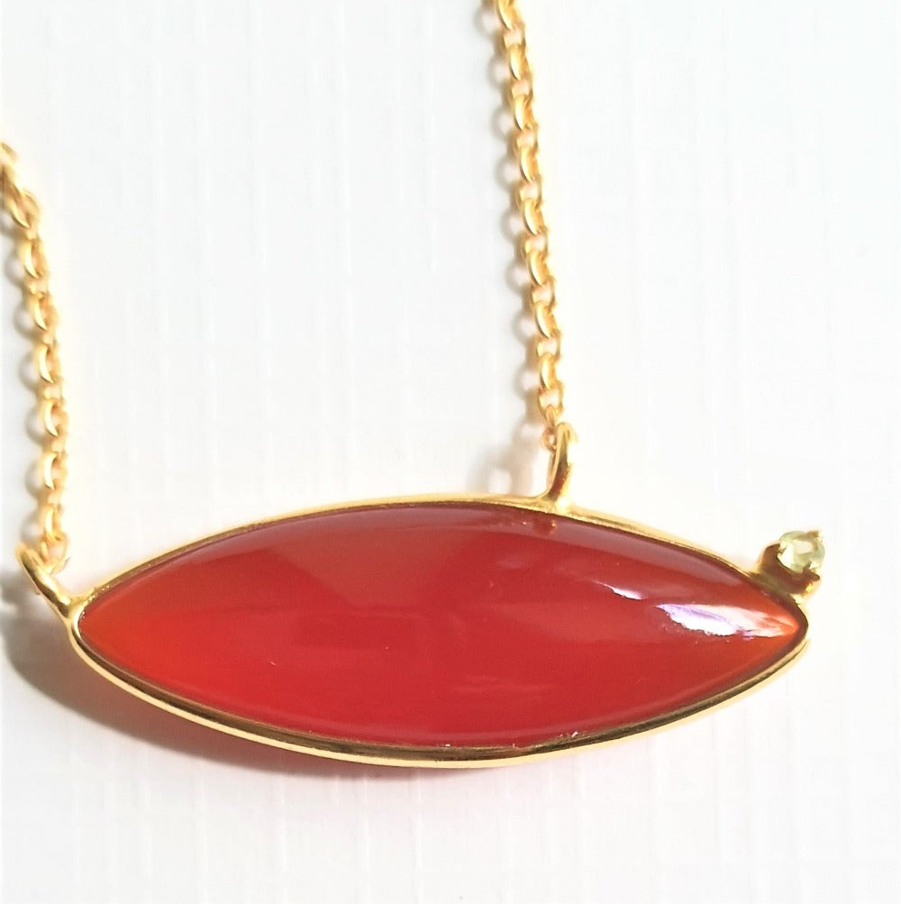 Experience the allure of our unique Red Onyx and Peridot necklace, designed to add a fresh spin to traditional pendant styles. The carefully crafted design features tilted petal, showcasing the vibrant Red Onyx and Peridot stones in an exquisite arrangement. Embrace the artistry and individuality of this pendant, making it a standout piece that will capture attention and admiration.