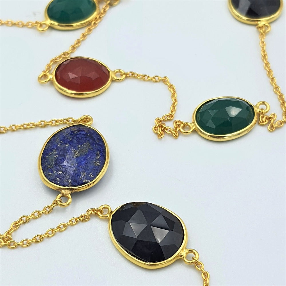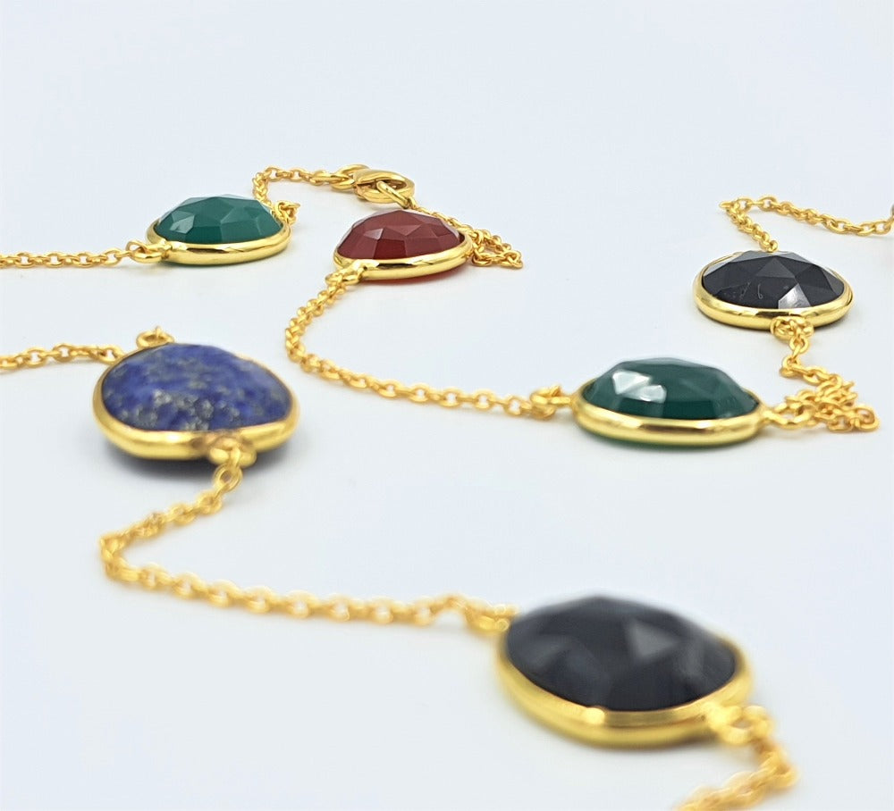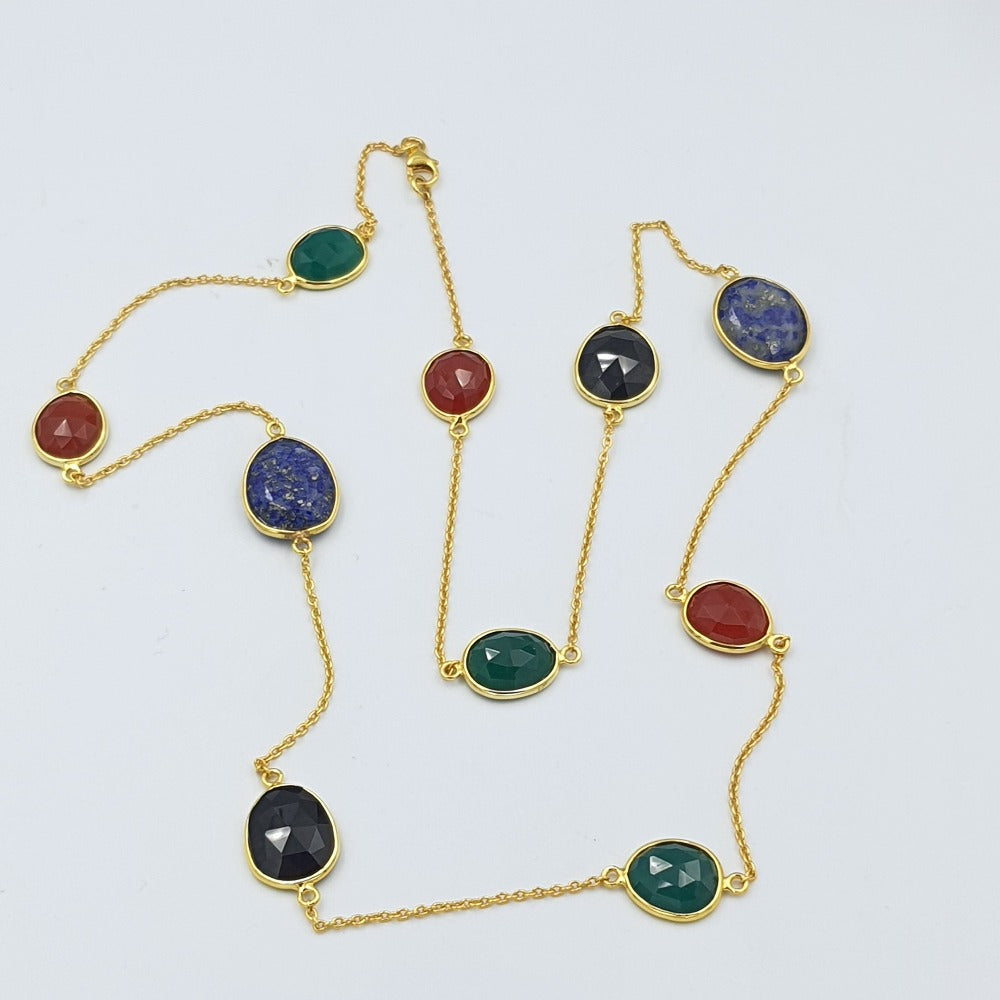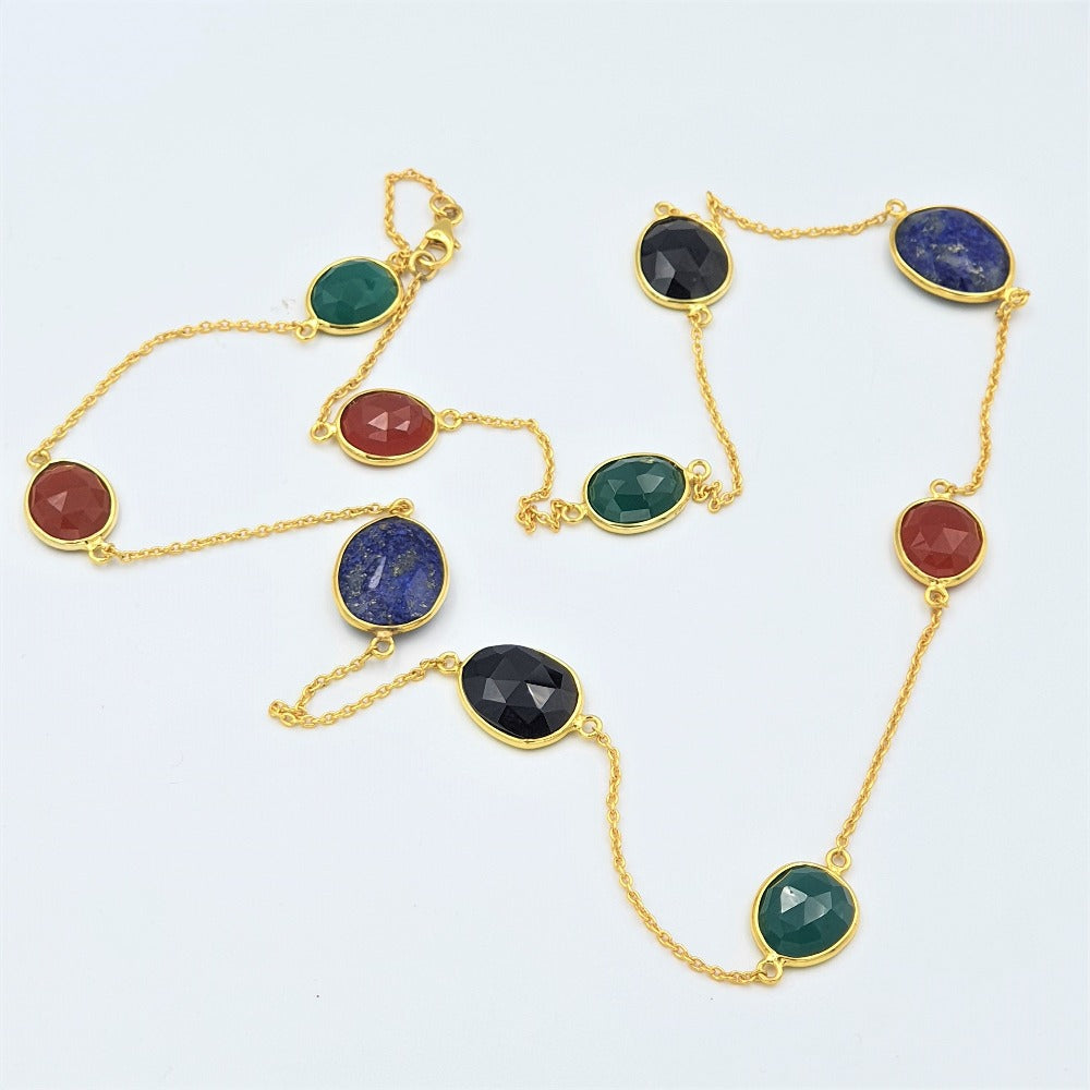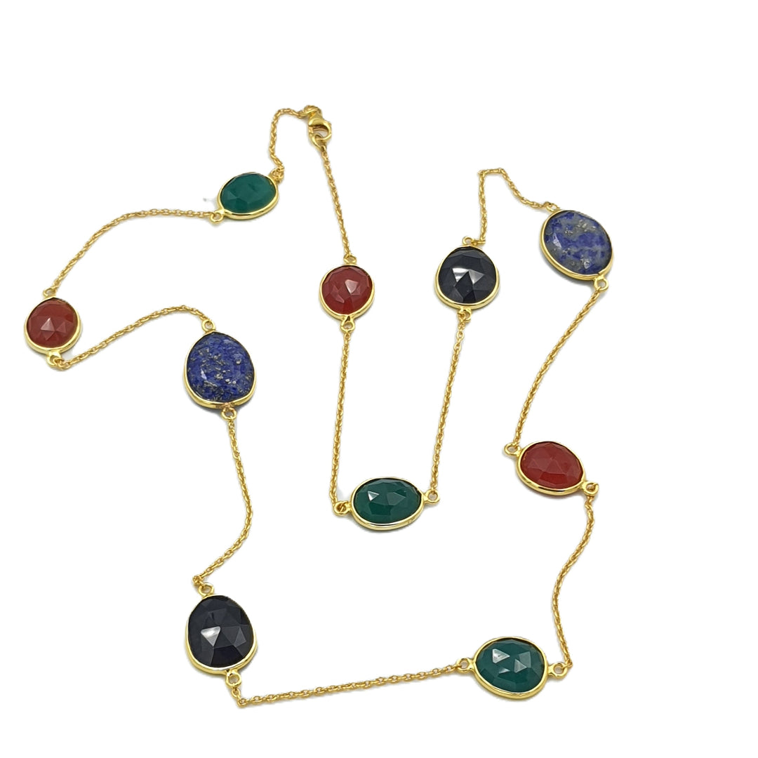 Experience a symphony of colors with our captivating Green Onyx, Red Onyx, Black Onyx, and Lapis Lazuli Necklace. This exquisite piece showcases the elegant beauty of vivid hues in perfect harmony. The mesmerizing combination of these gemstones depicts a kaleidoscope of colors, radiating an aura of sophistication and captivating the eye of all admirers.