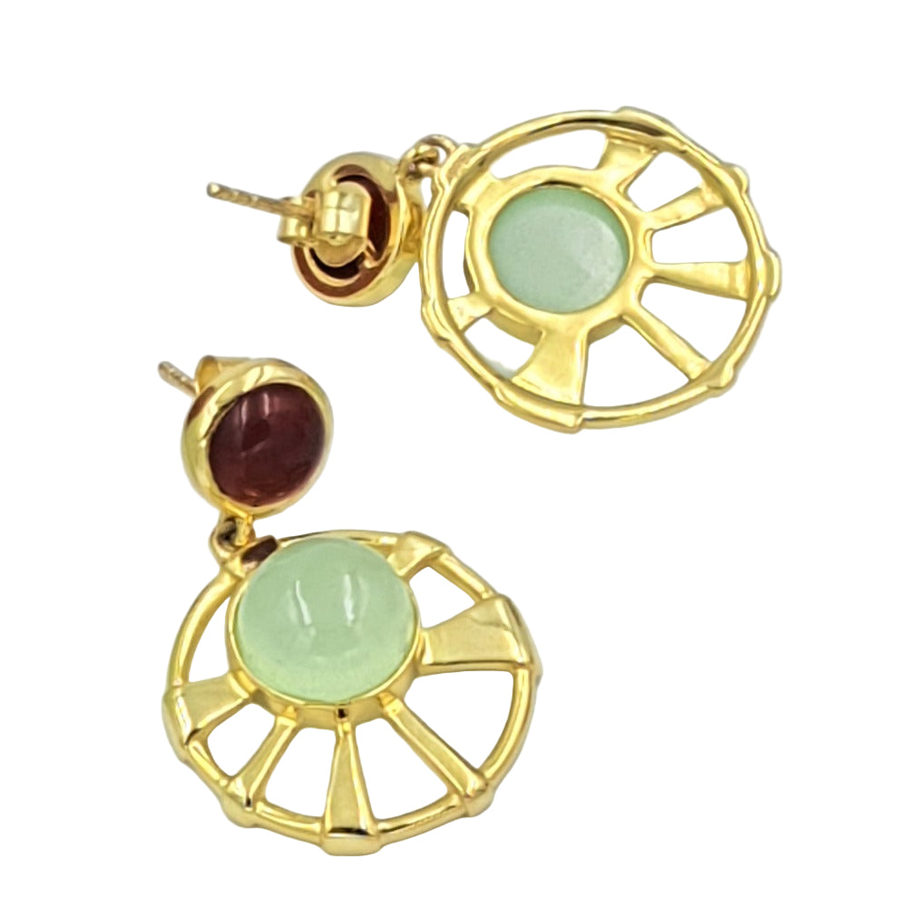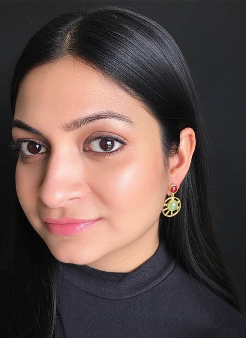 These circular earrings, made of Red Onyx and Prehnite Chalcedony, will look charming on you. Their striking combination of rich red and calming green hues creates a captivating contrast that complements any outfit. Go ahead and spin your wheel of charm, showcasing your unique style and elegance with every turn.
